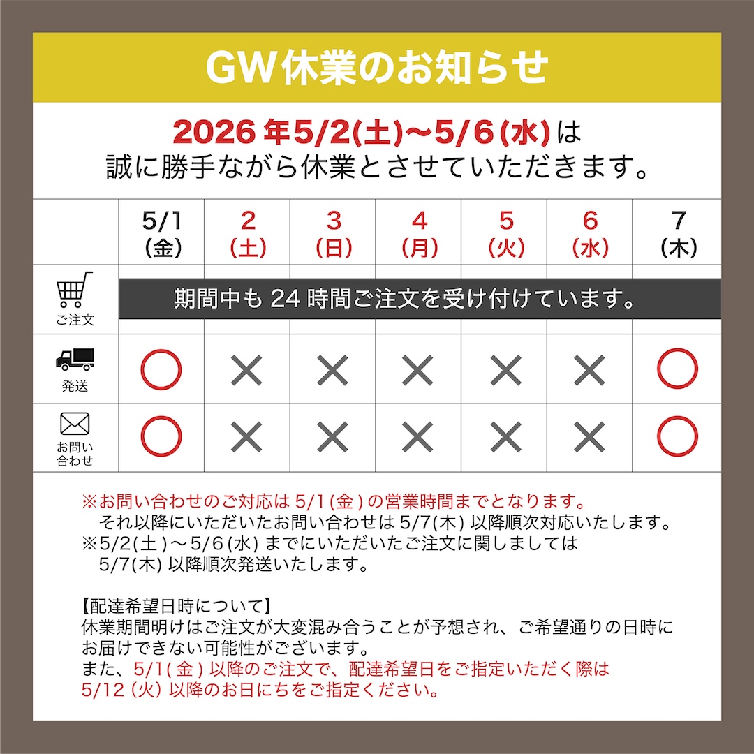 それ以降にいただきましたお問い合わせは5/7(木)以降順次対応いたしますが、休業期間明けはご注文、お問い合わせの混雑により、通常よりご回答にお時間を頂戴する場合がございます。