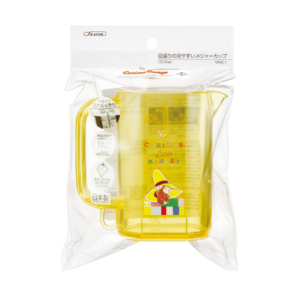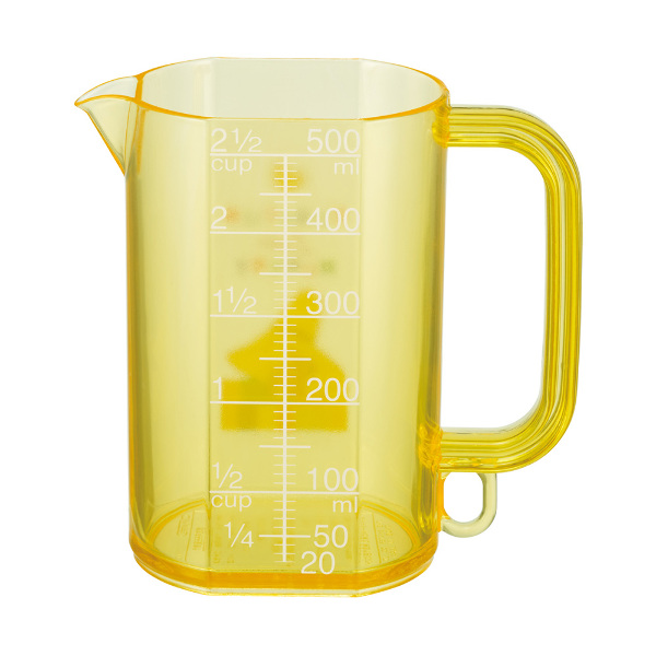 側面が平らで半透明、字が大きくてとにかく見やすいメージャーカップ。清潔に吊るしておける逆さ吊りフック穴付き。