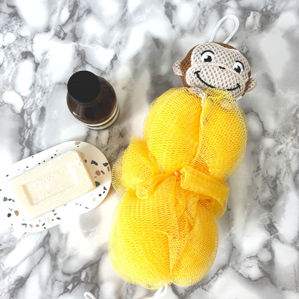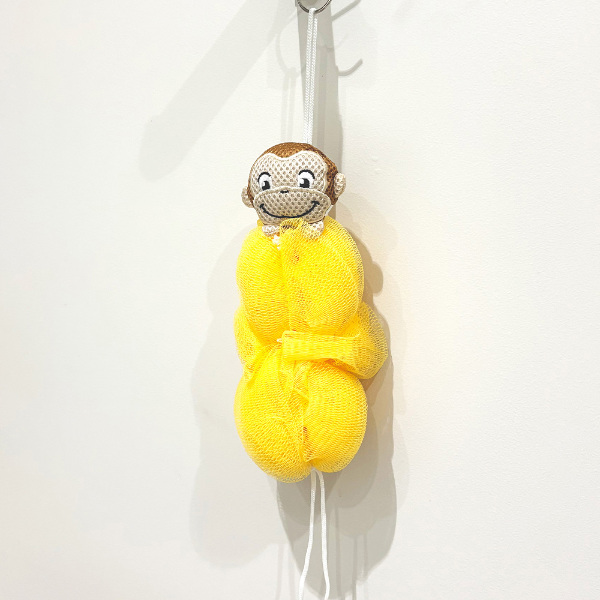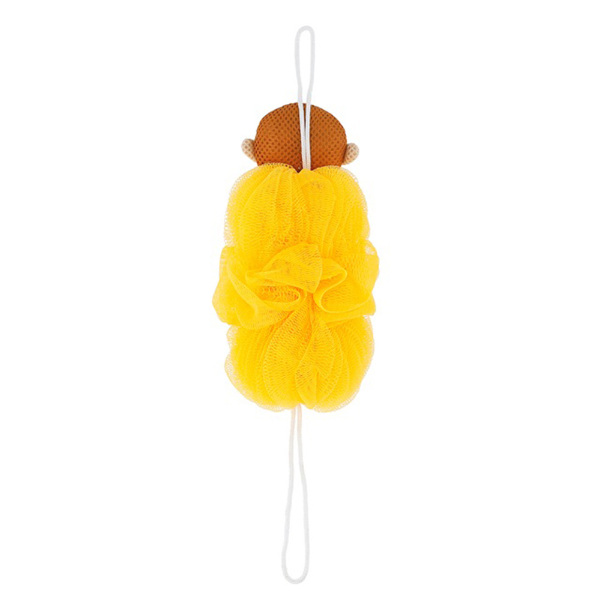 かわいいフェイスマスコットがついた泡スポンジです。