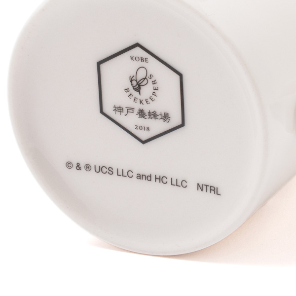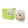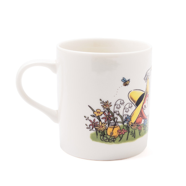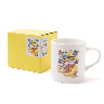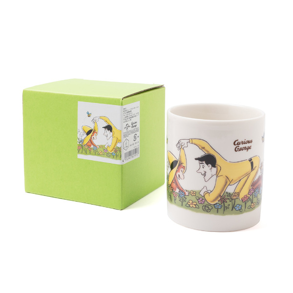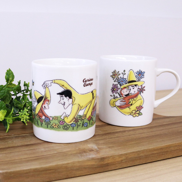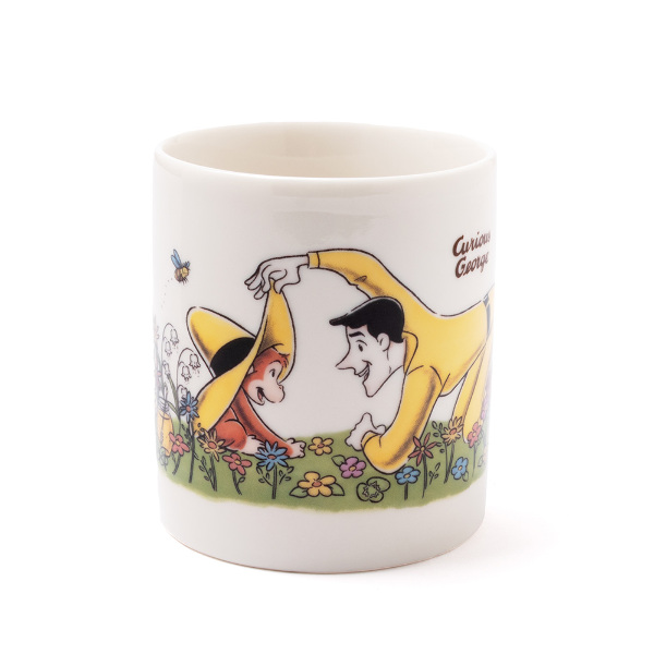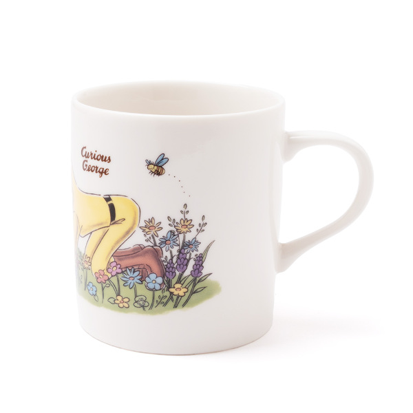 たくさんのお花に囲まれたジョージと黄色い帽子のおじさんが描かれたマグカップ。色鮮やかなデザインがティータイムを華やかにしてくれます。