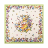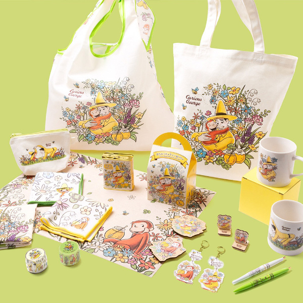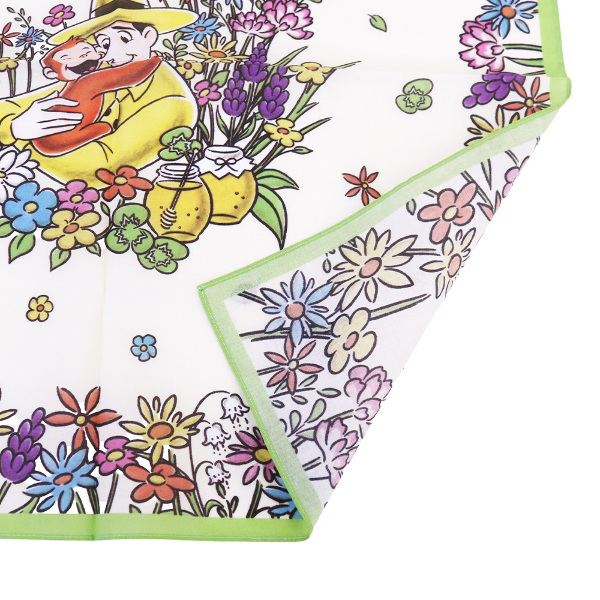 お花とミツバチに囲まれたジョージと黄色い帽子のおじさんが描かれた大判ハンカチです。ハンカチとしてはもちろん、バンダナやクロスとしても活躍します。