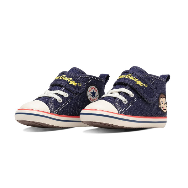 アメカジスタイルに人気のデニムやコットンツイル素材を採用したアッパーにジョージとバナナのワッペンを落とし込み、ベルトには「Curious George」のロゴを刺繍した可愛らしいデザイン
